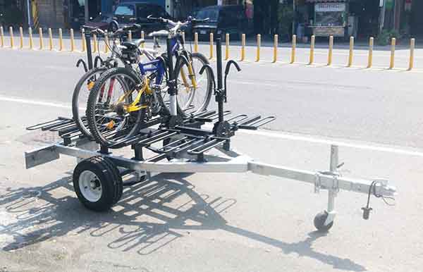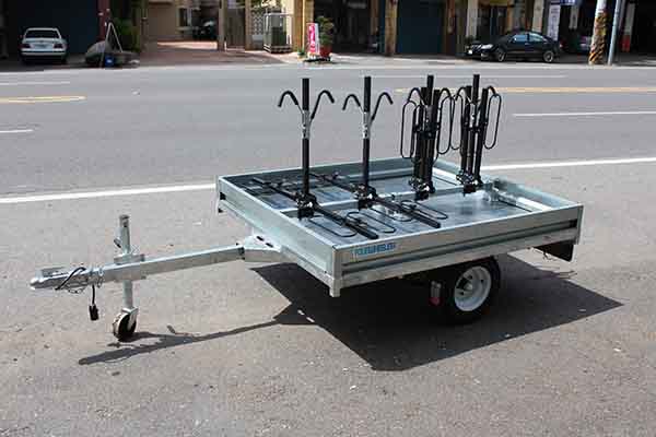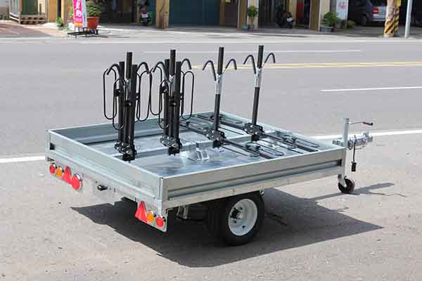 專為深度團體旅遊而設計的專用拖車,可承載八台單車,搭配一台八座母車,針對小團體可作鄉間深度旅遊,增進旅遊樂趣,單車隨時備用,走到哪裡用到哪裡. (輕便型) (特裝樣式) ) 總長度:311公分 寬度:160公分 195/55R10 MAXXIS 拖車專用胎 全車90%熱浸鍍鋅防鏽處理 搭配美國CURT專業單車架 全車重量約200公斤,輕巧靈活.